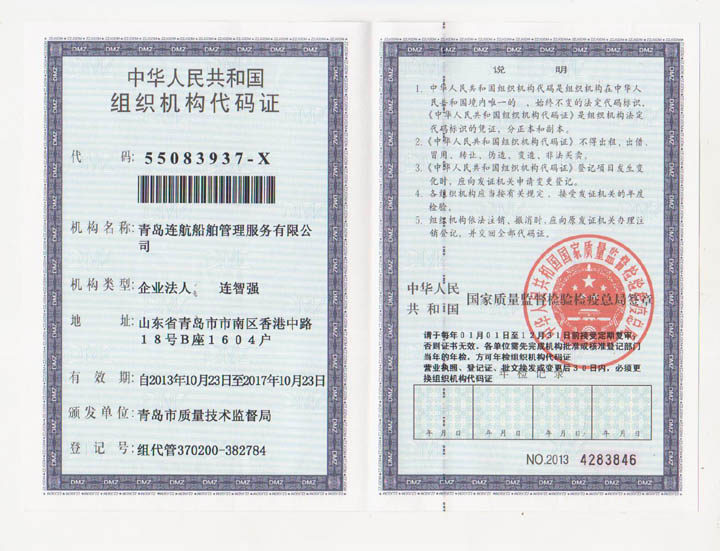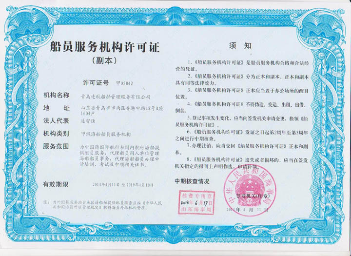 2012年04月青島連航船舶管理服務有限公司取得《海員外派機構資質證書》,為海洋船舶提供配員,代理船員用人單位管理海洋船舶船員事物,代理海洋船舶船員申請培訓、考試、申請證書等業(yè)務。