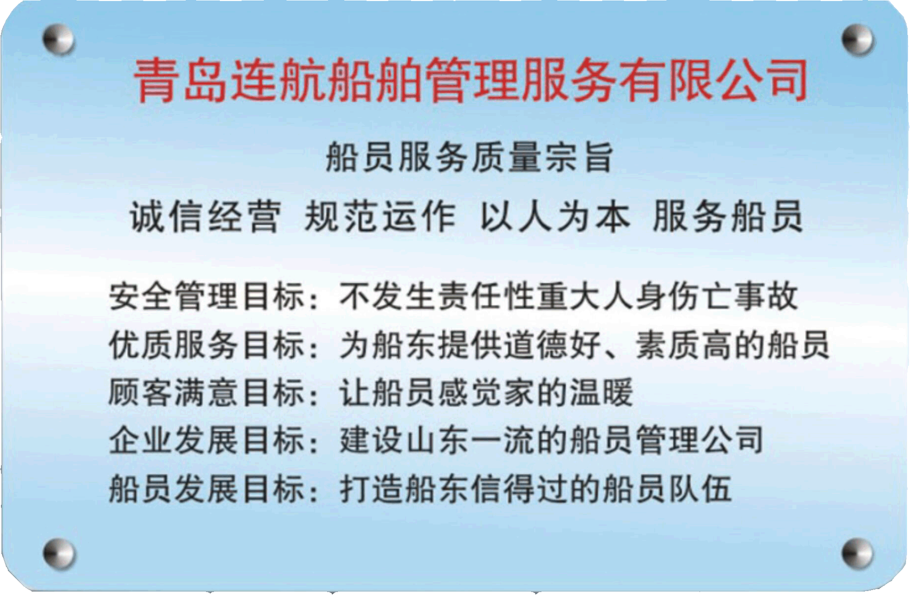 青島連航船舶管理服務有限公司(以下簡稱公司)是經(jīng)中華人民共和國海事局批準認可的海員外派服務機構(海員外派資質證書編號:HYWP05016),是國家工商行政管理局注冊批準的股份制企業(yè),注冊資金600萬元。公司主要業(yè)務是代理海船船員辦理申請培訓、考試、申領證書等有關手續(xù),代理船員用人單位管理海船船員事務,為國內外航行海船提供配員與輸出等活動;同時提供信息咨詢、船舶技術咨詢、海事信息咨詢、經(jīng)濟信息咨詢、商務服務、船舶物料供應、船舶維修、船舶代理貨運代理等服務業(yè)務。