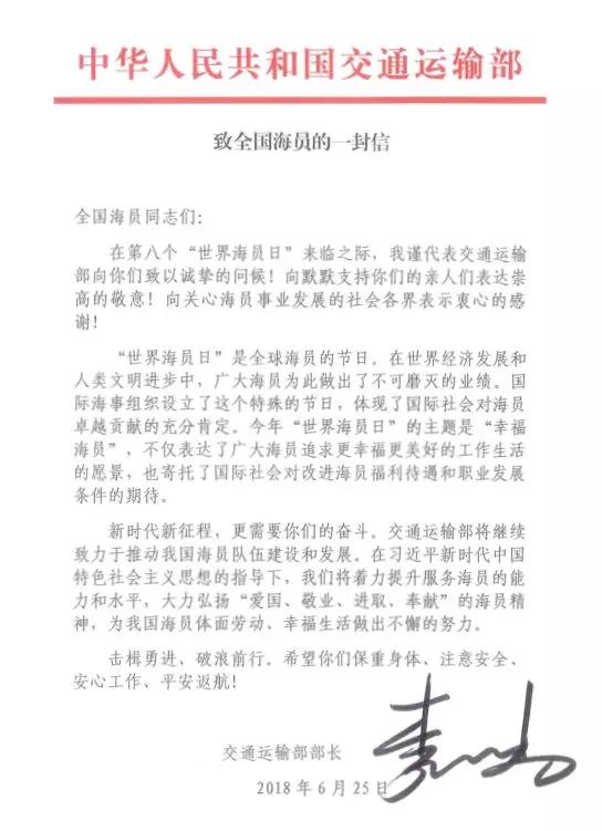 交通運(yùn)輸部部長李小鵬致信慰問全體海員。25日,中國籍民用船舶、中國航運(yùn)企業(yè)擁有或光租的非中國籍船舶將掛滿旗慶祝。在國外部分港口,中國駐地使領(lǐng)館將派員登輪慰問在港停泊的中國海員。此外,交通運(yùn)輸部海事局與中國海員建設(shè)工會共同組織開展了大規(guī)模的“2018年媒體走近海員”新聞采訪活動,22名媒體記者分乘6艘船舶,和海員同吃同住同工作,身臨其境,現(xiàn)場報道,向社會展現(xiàn)當(dāng)代中國海員的風(fēng)采。